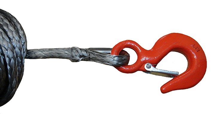 10mm x 30m graphite 12-strand dyneema ® synthetic winch rope with a thimble spliced one end with 2T Safe working load safety hook.  Heat sealed the other end.