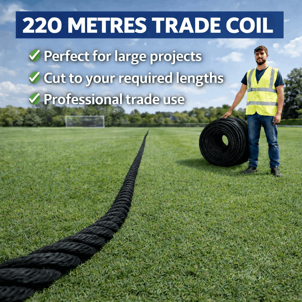 20mm Black 3-strand twisted split-film Polypropylene rope supplied in a bulk 220m coil.  This rope has an approximate breaking strain of 5,370kg.  * PLEASE NOTE – All tensile break strength tests are carried out to ensure that product & manufacturing processes are being met. These tests are not a certification for the product when it is to be used in a lifting or pulling process.